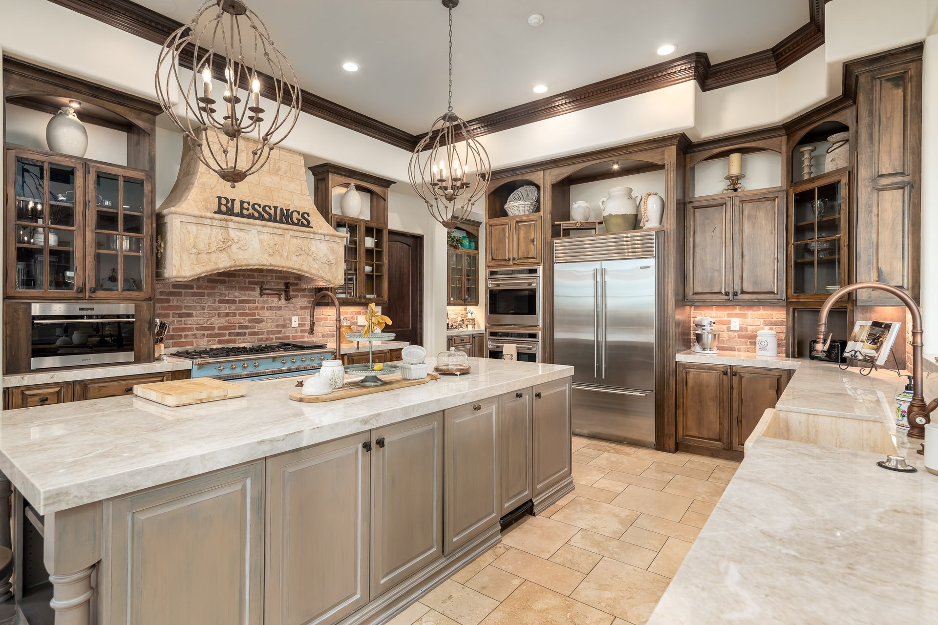 Soaring wood-beamed ceilings, custom finishes, and a striking limestone hood create a warm Mediterranean escape. The Calacatta marble island anchors the space…perfect for shared breakfasts, wine-filled conversations, and timeless moments. A Sub-Zero refrigerator wrapped in custom wood paneling completes the look with quiet, understated luxury.